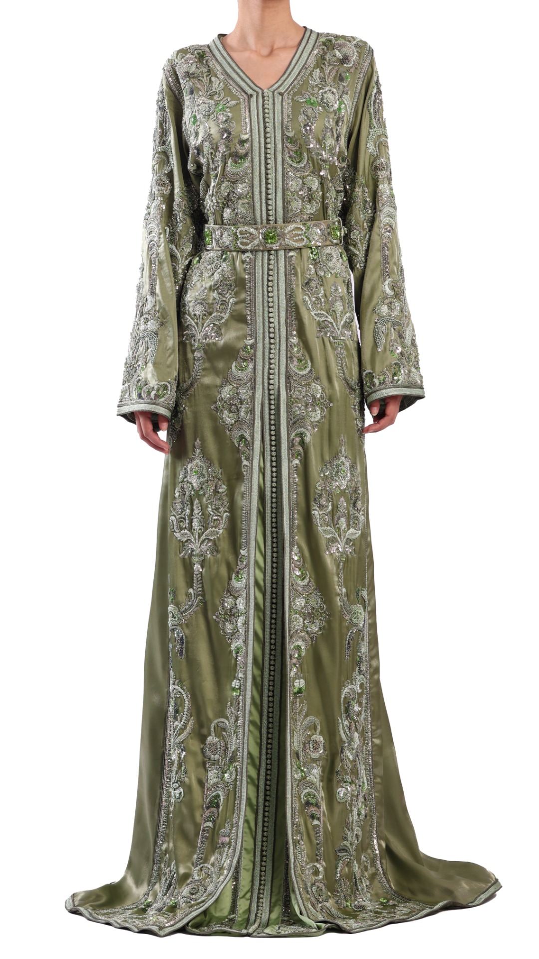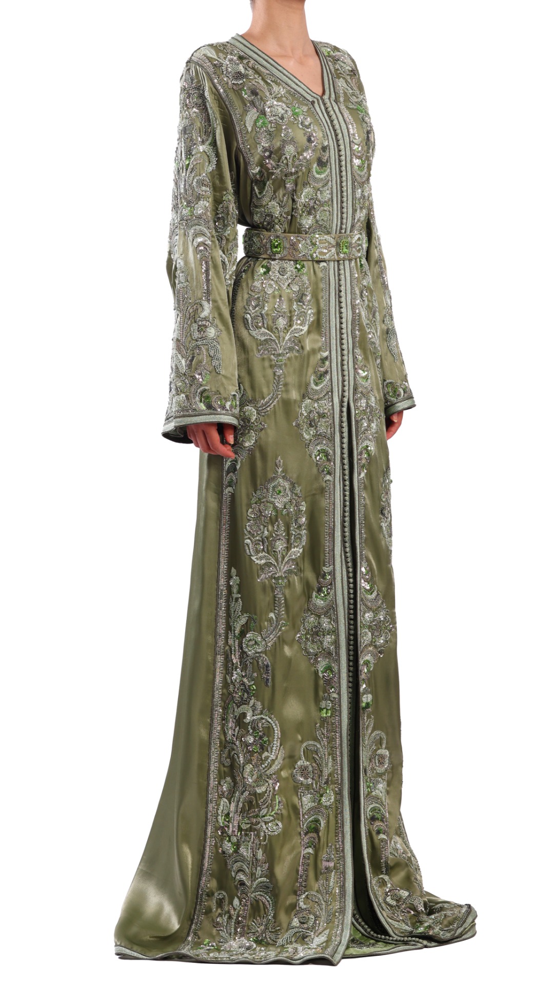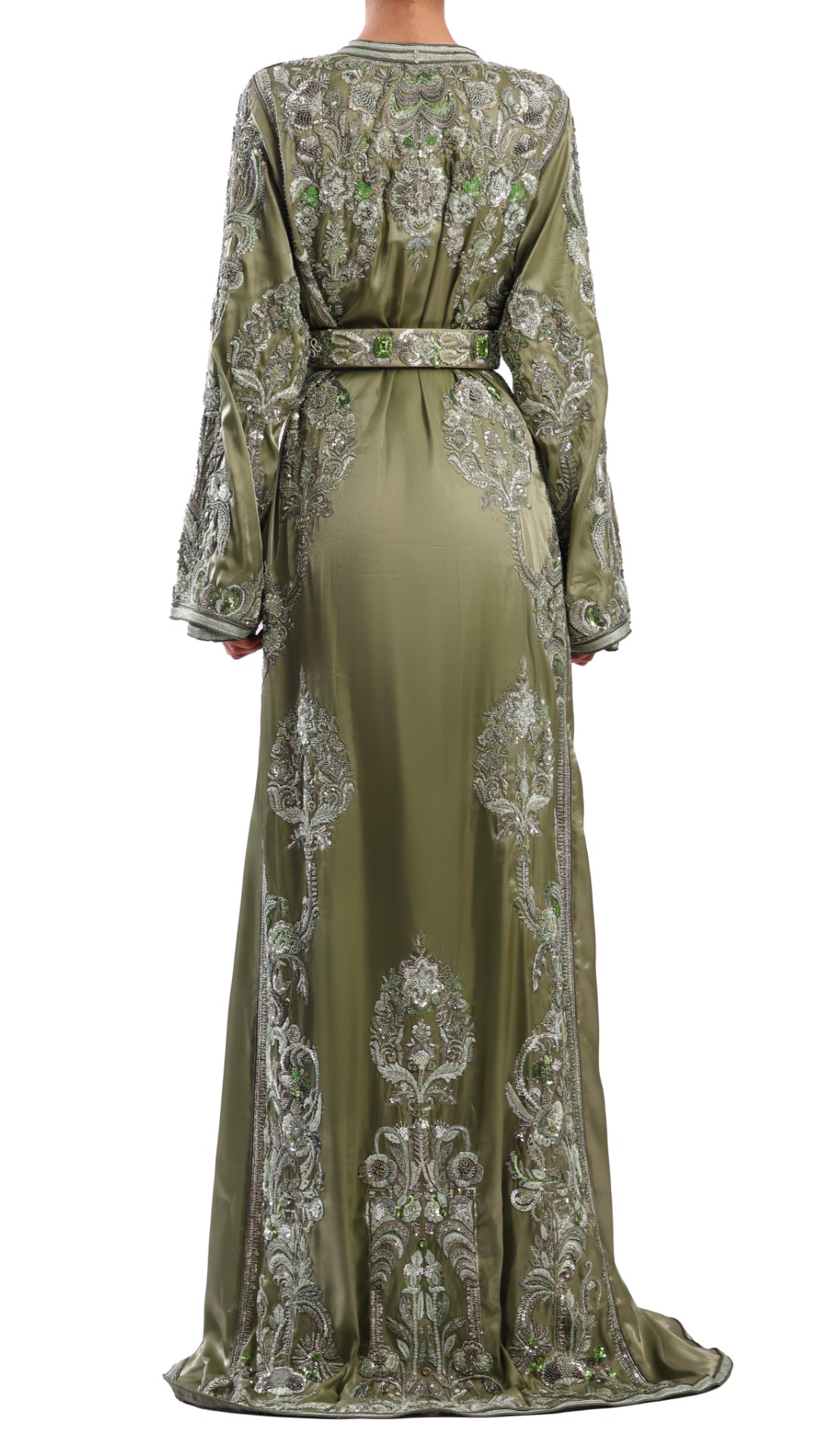 Embrassez l’élégance de la tradition avec notre époustouflant caftan hemlock vert, savamment confectionné à partir d’une riche combinaison de satin organza épais pour la « Dfina » et de satin soyeux et fluide pour la « Tahtiya ». Fabriquée à la main par l’équipe dévouée de MAISON AHMED, composée de plus de 19 artisans, cette robe représente plus de 797 heures de travail artistique méticuleux, créant un véritable chef-d’œuvre qui se distingue par son design complexe et sa signification culturelle.