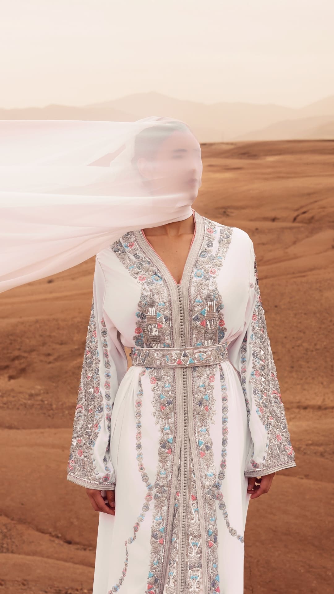 Le caftan Radiant White Harmony prend vie grâce au dévouement de plus de 16 artisans, avec plus de 612 heures de travail investies dans sa création. Dotée d’un décolleté modeste, d’une ceinture fabriquée à la main et d’un design asymétrique, cette robe allie harmonieusement l’art traditionnel à l’élégance contemporaine, inspirée par la culture marocaine et arabe.