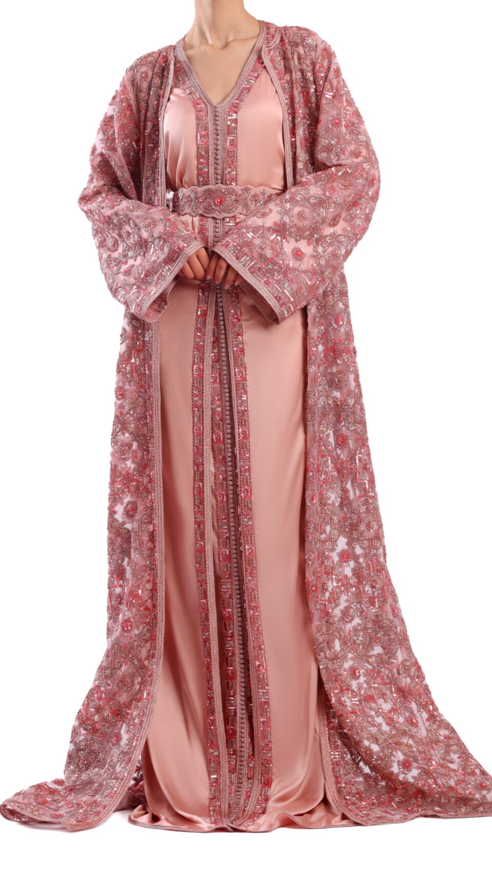 Discover the enchanting Ethereal Blossom Kaftan, a stunning three-piece gown that transitions effortlessly from elegance to enchantment, perfect for making a memorable statement at sophisticated events and celebrations.