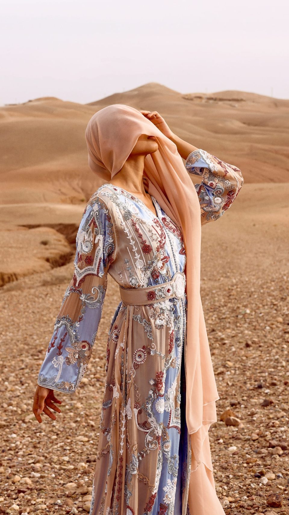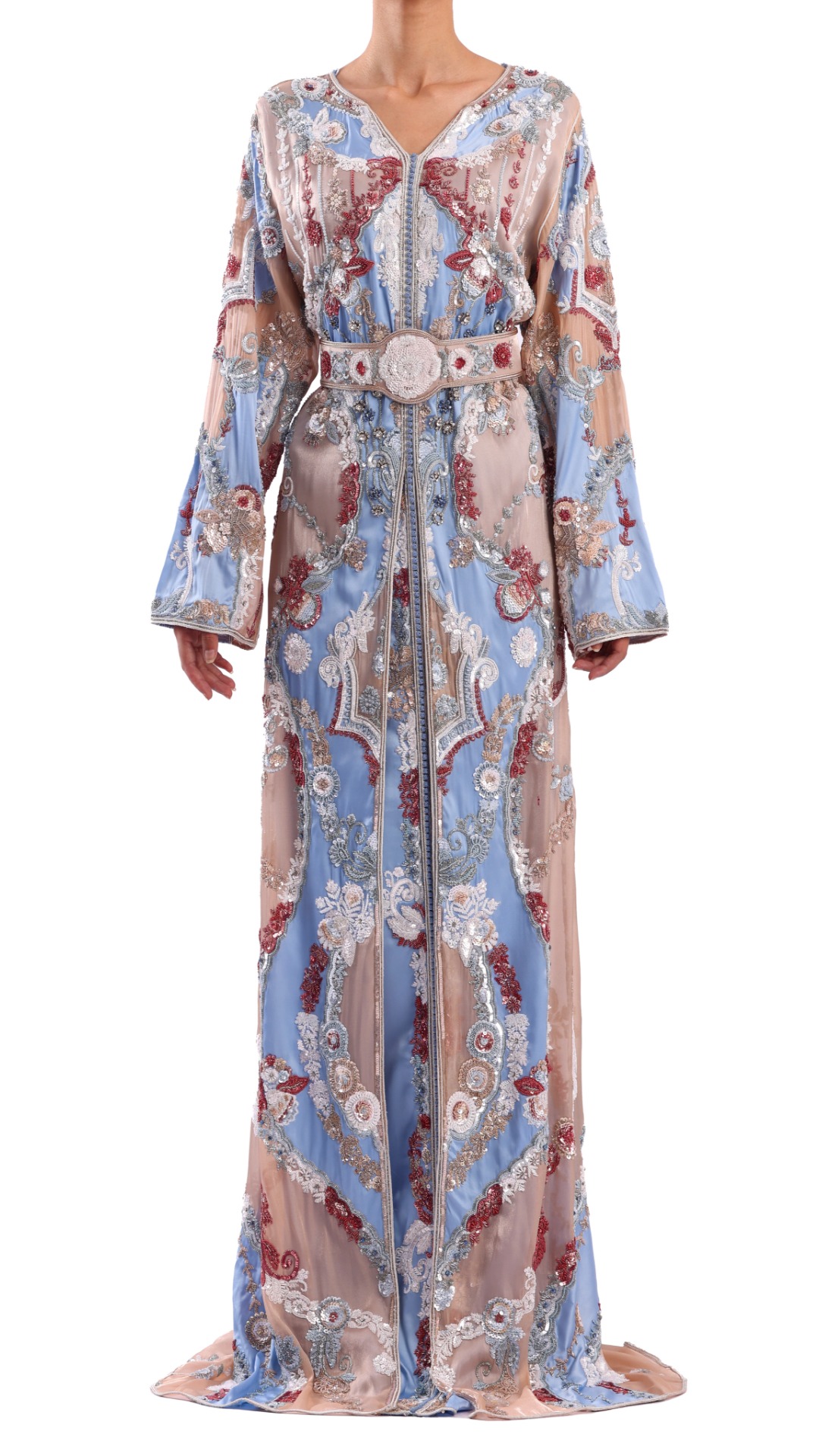 A captivating two-piece bridal Kaftan, combining clam shell satin organza with dark pastel blue satin. Hand-embroidered with intricate beadwork, this dress radiates a colorful and graceful elegance.