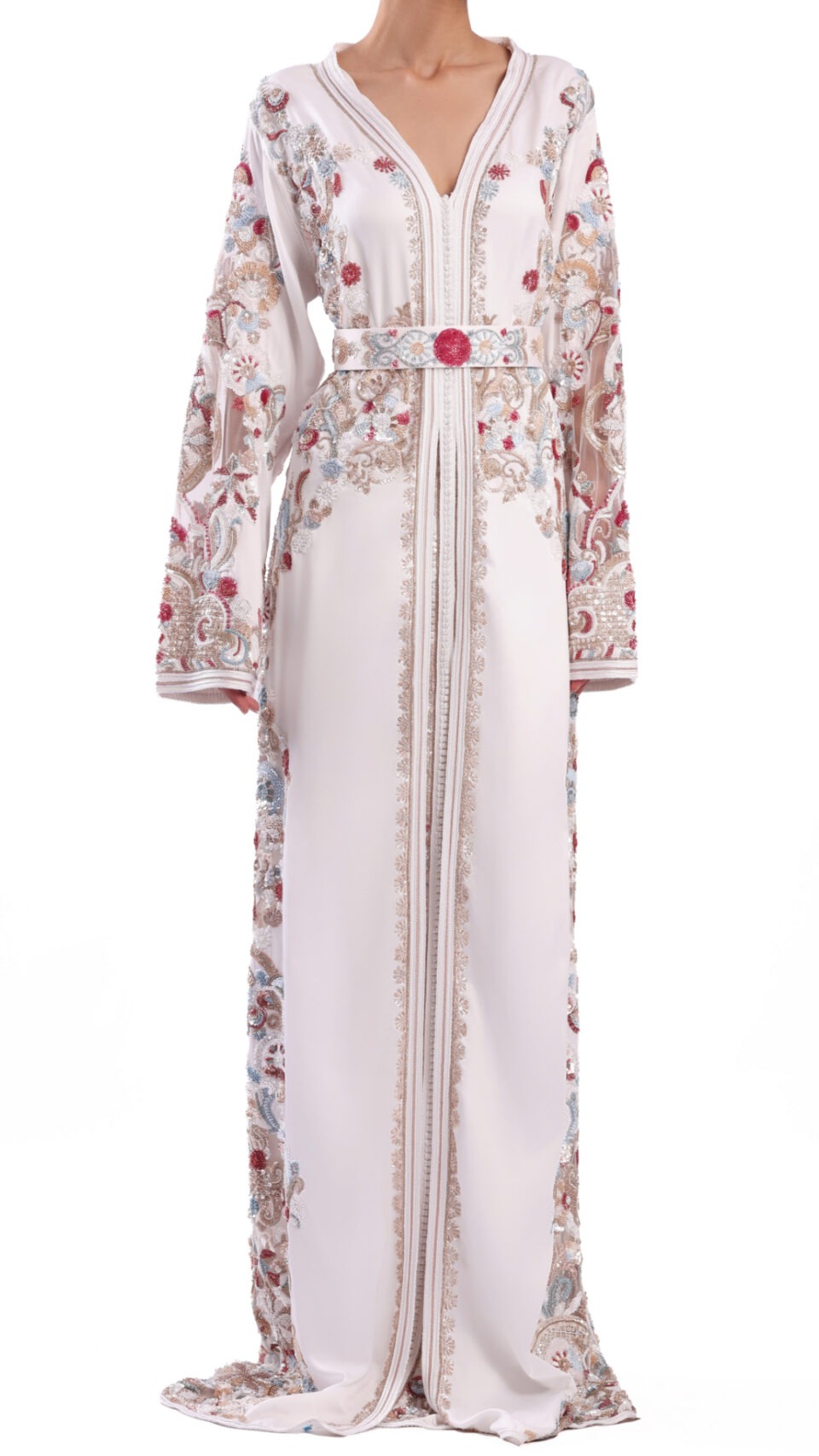 The Luminous Serenity Kaftan is a stunning blend of thick silky satin and delicate white tulle, elegantly adorned with intricate hand embroidery, perfect for the modern bride.