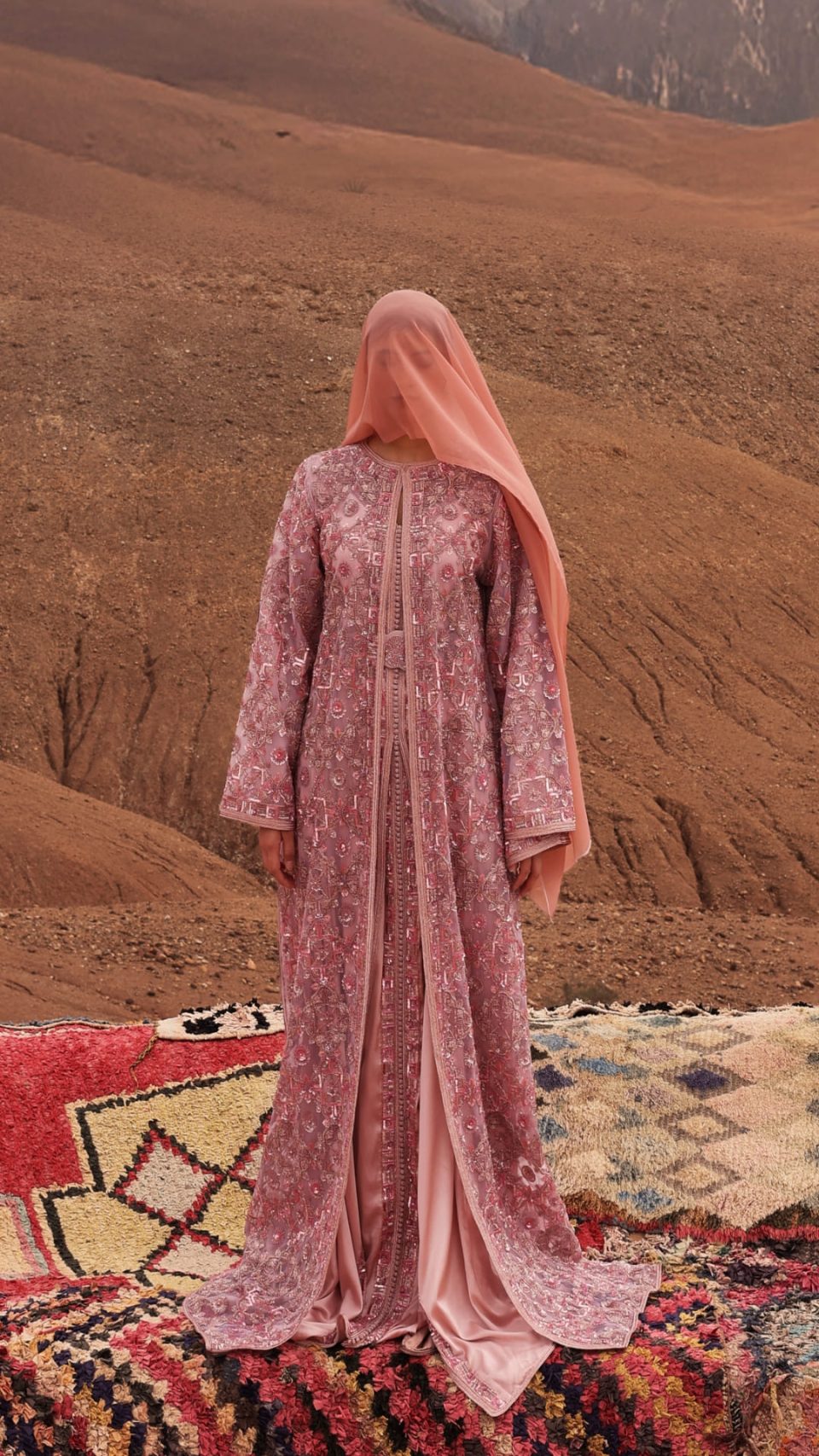 Unveil timeless elegance with the Majestic Mirage Kaftan, a sophisticated two-piece gown that harmoniously intertwines traditional Moroccan craftsmanship with stunning geometric motifs, perfect for bridal ceremonies and special gatherings.