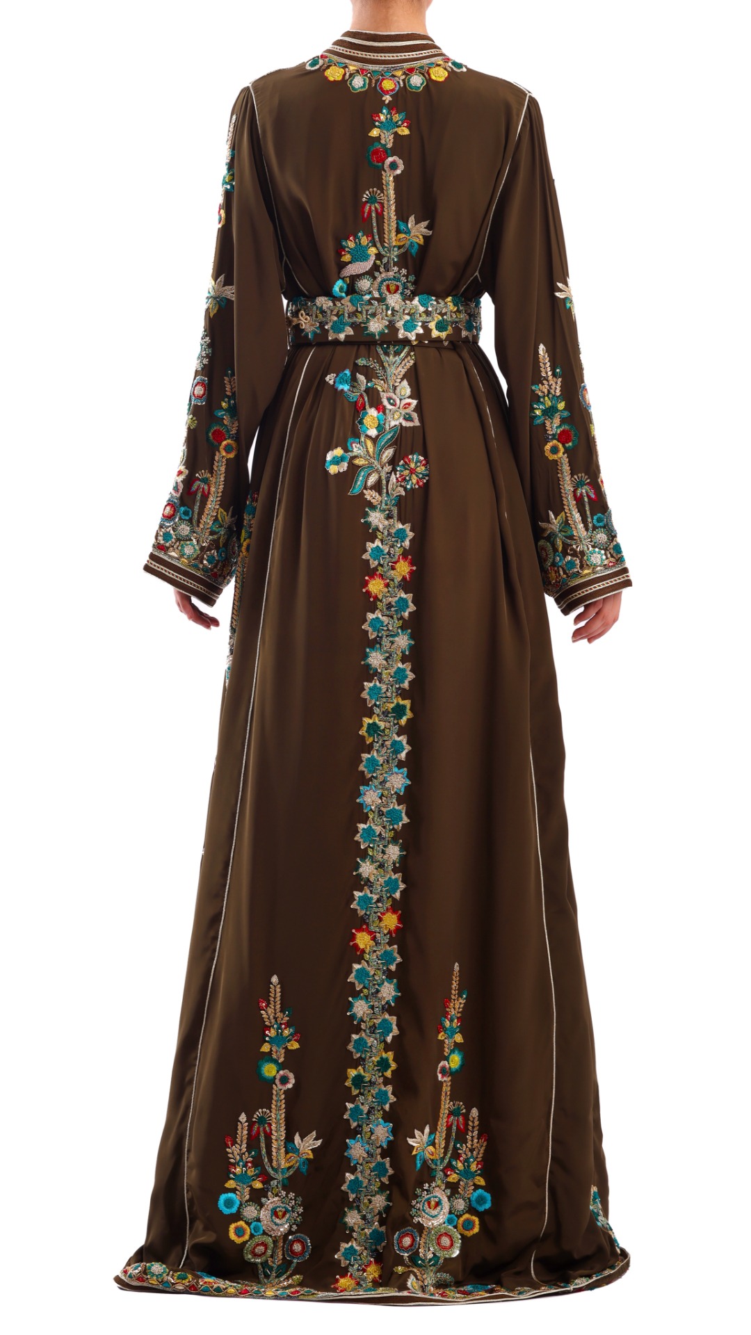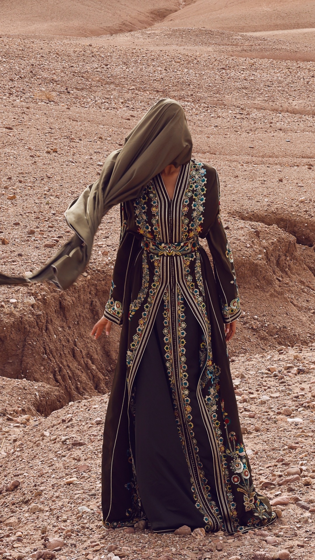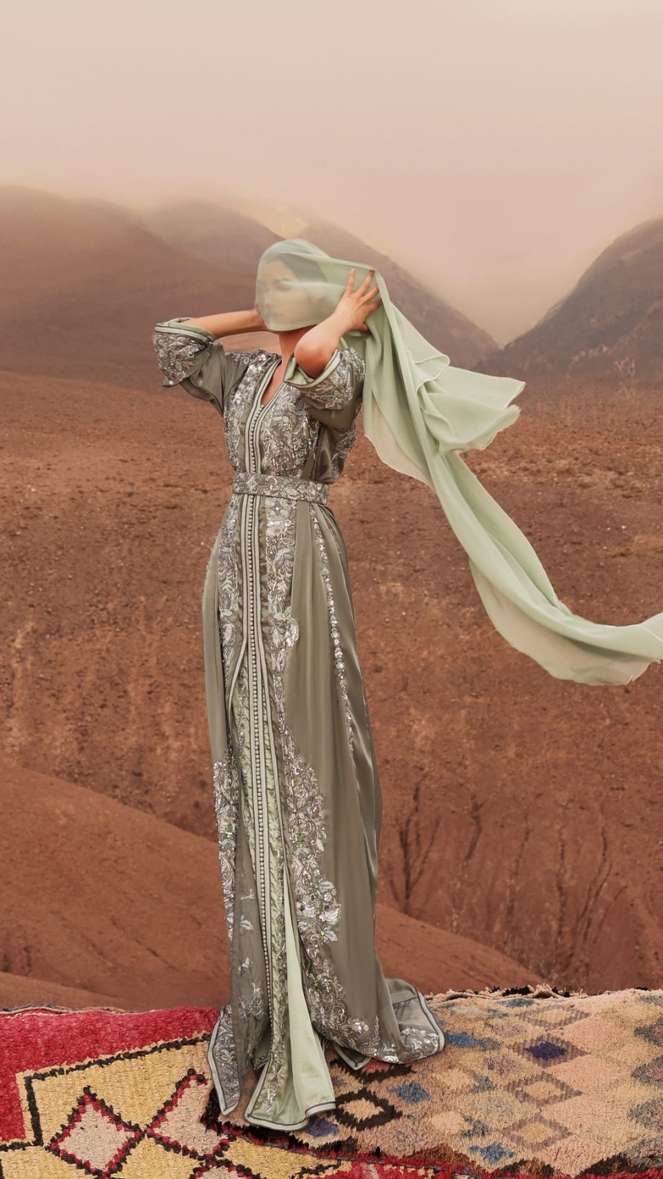 Step into a realm of vibrant elegance with our captivating birch and heavy metal green Kaftan, an exquisite blend of the lightweight crepe “Dfina” and sumptuous Milano satin “Tahtiya.” Handcrafted by Maison Ahmed’s skilled artisans, this gown is the result of over 694 hours of intricate workmanship, showcasing the rich artistry that defines our haute couture collection.