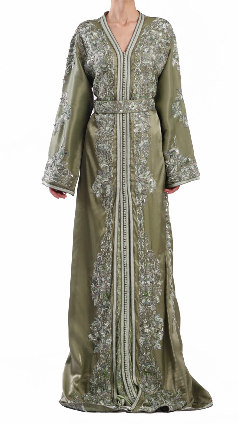 Completing the design are the intricate handmade metallic lace, or “Sfifa,” and the elegant buttons known as “Akaaid.” Wearing this gown means embracing the elegance of Moroccan and Arabic culture, woven into every thread. It’s not just a dress; it’s a celebration of artistry and heritage, designed to make every moment extraordinary.