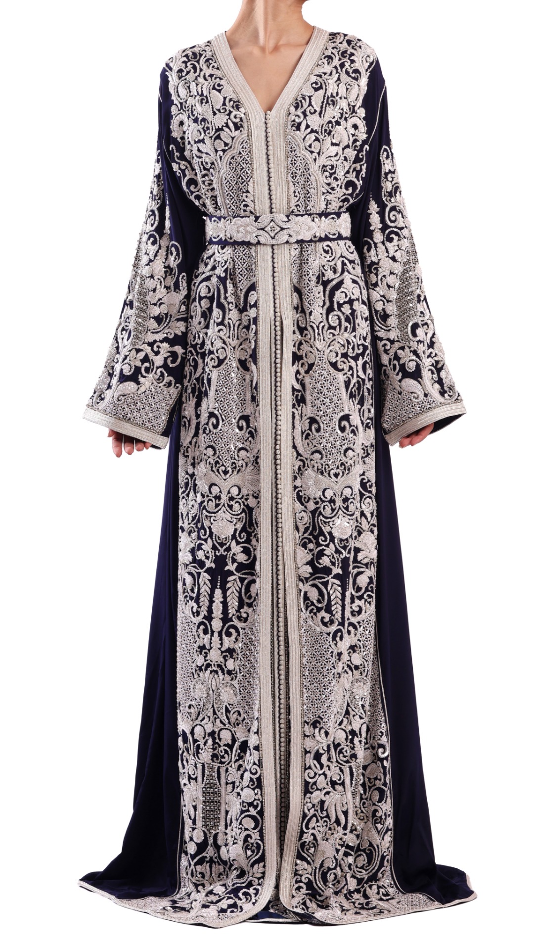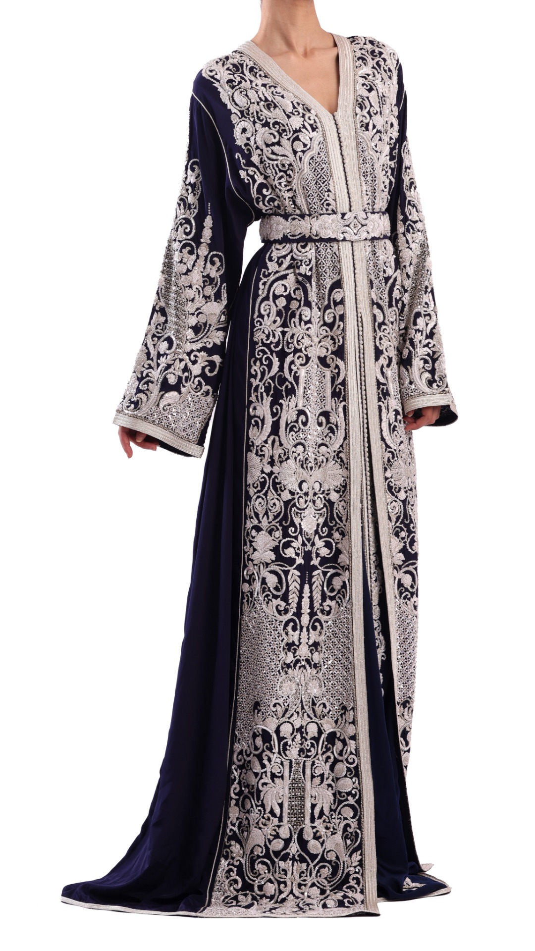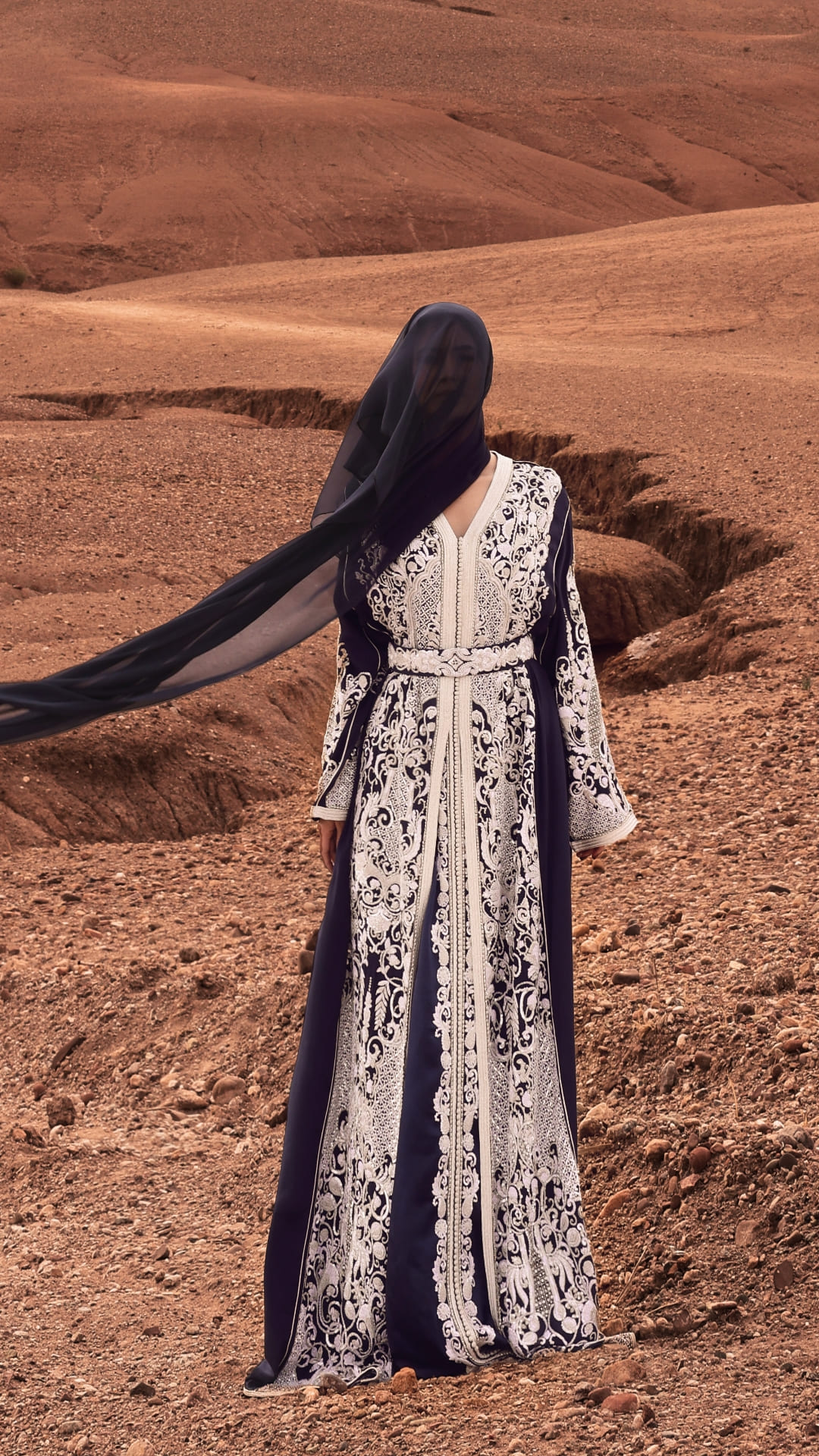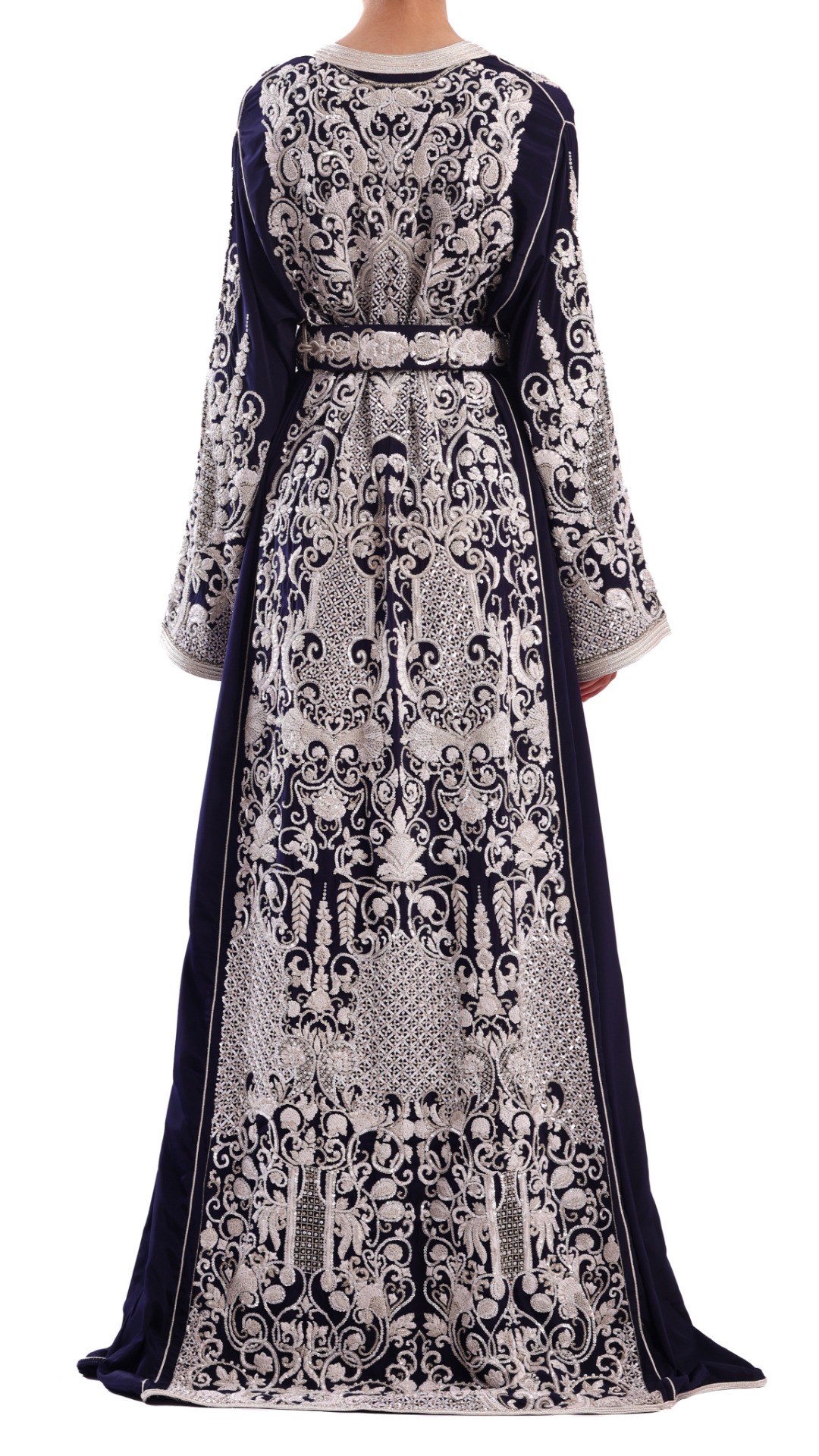 Step into a world of elegance and cultural heritage with this breathtaking navy blue Kaftan, handcrafted by Maison Ahmed’s team of 18 master artisans. With over 840 hours of meticulous work, this gown is more than just a garment—it is a testament to tradition, skill, and artistry. Each stitch, whether formed by silver metallic thread or delicate white silk, reflects the essence of Moroccan craftsmanship. The dress features two harmonious layers: a lightweight crepe “Dfina” that flows gracefully over a luxurious satin “Tahtiya,” resulting in a flattering A-line silhouette.
